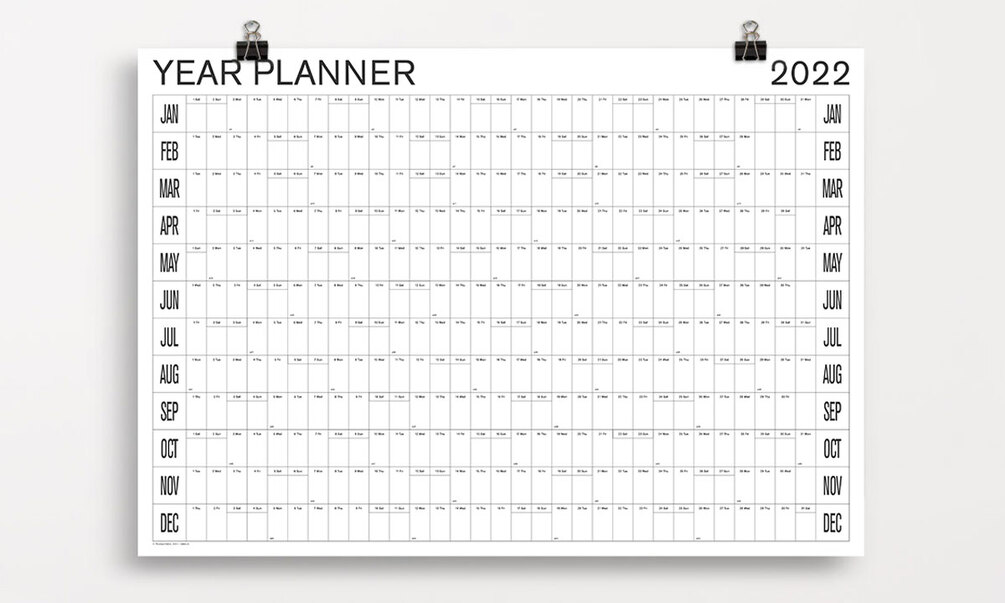 Useful wall planner for 2022, giclée-printed in black on thick and durable matte paper. It measures 700x1000mm, the paperweight is 189 g/m² with a paper thickness of 0.26 mm.
